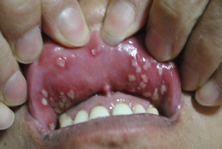 又称复发性口腔溃疡,外观为单个或者多个大小不一的圆形或椭圆形溃疡,表面覆盖灰白或黄色假膜,中央凹陷,边界清楚,周围黏膜红而微肿。具有周期性、复发性、自限性的特征,年龄不拘,发病年龄估计在10~20岁之间,女性较多。一年四季均能发生,能在10天左右自愈。
