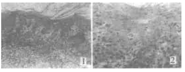 手术后病理诊断: 右颊部OLP,局部恶变呈高分化鳞癌改变(图1、2)。