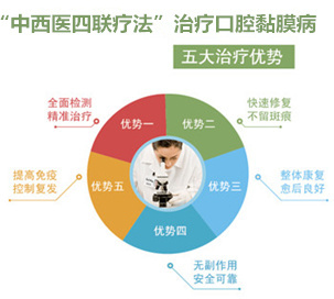 “中西医四联疗法”采用中西结合方法,融合祖国中医的精粹以及西医的免疫学、基因学等,配合免疫系统修复仪,辅以独家中药秘制配方结合治疗口腔扁平苔藓。该疗法打破了传统治疗扁平苔藓久治不愈、反复发作的弊端,从对患者身体免疫系统的调节和修复着手,采取精确诊断,分型分治,分期治疗的原则,循序渐进,从整体上治疗扁平苔藓疾病。彻底清除口腔病菌,改善口腔环境,同时快速有效的重建患者身体免疫力,真正达到从根本解决扁平苔藓的问题,起到治愈目的。
