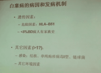 目前该病的发病原因不完全清楚,可能与遗传(如HLA-B51基因)、感染(部分病人可能与结核感染相关)、生活环境都有关系,好发于古代“丝绸之路”沿线的国家和地区,包括中国、土耳其等。