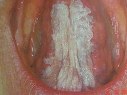 均质型:口腔黏膜上白色或灰白色均匀斑块,圆形、椭圆形或不规则形。斑块平坦或稍高出黏膜表面,表面有皲裂,便杰青清楚,触诊柔软,略粗糙。患者多无自觉症状或有粗糙感。