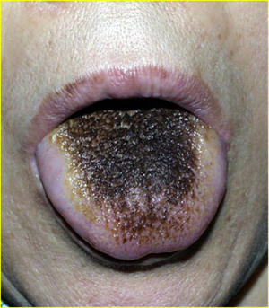 6、毛舌:舌背丝状乳头过度伸长,可呈黑、褐、白、黄、绿等多种颜色,而分别称为黑毛舌、白毛舌、黄毛舌、绿毛舌等。病因认为与口腔环境状况不佳有关,滥用抗生素、吸烟、还有糖尿病、贫血、放射治疗,以及以毛霉菌属的黑根霉菌最常见。临床表现为舌背正中部丝状乳头增生呈毛发状,口臭。